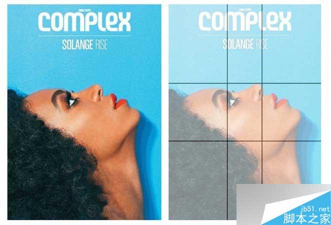 這個案例是Complex雜志的封面,整體布局符合黃金比例,而黃金比例三分法下的兩個交點上則正好和女性的鼻子與眼睛上。