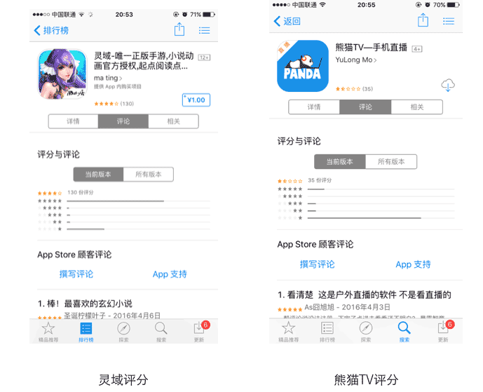 如下圖AppStore里兩個APP的評分,靈域的評分比較好,也促成了交易的達成。而熊貓TV的評分很低,影響了新用戶下載率。(最可怕的是這個排序最靠前的熊貓TV是一個戶外直播,不能注冊也沒給出相應的說明,其實排序第二的那個APP才是真正用戶想要下載的熊貓TV)