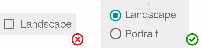 我們應使用單選框更改設置,而不是像使用行動按鈕那樣來執行命令。另外,直到用戶點擊行動按鈕(例如“繼續”或“保存”等)被更改的設置才可生效。如果用戶點擊“返回”或“取消”按鈕,該頁面應恢復初始狀態,此時任何應用了單選框的設置都會被清空。