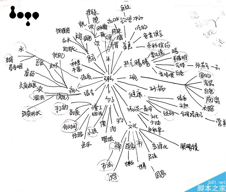 經(jīng)過頭腦風(fēng)暴后,聯(lián)想了很多關(guān)于粥的設(shè)計元素,其中的一個設(shè)計方案選取部分關(guān)鍵詞“碗”“勺子”“流質(zhì)的”“歡樂的”等關(guān)鍵詞進行組合創(chuàng)意,最終設(shè)計出方案,