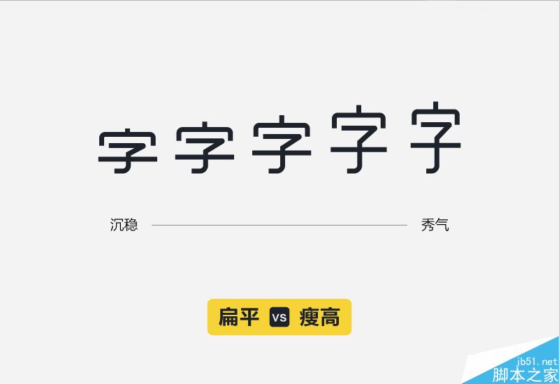 漢字我們經常稱其為“方塊字”是由其結構特征所得,通常情況下比較纖瘦、高挑的字形更具文藝氣息,偏女性化更多一些;而扁平的字形重心偏低更沉穩,莊重一些。