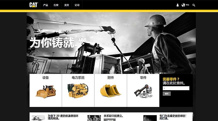 CAT是一家專業(yè)做重工業(yè)設(shè)備的公司,所以整個頁面采用黃色作為突出色,黑色作為主色,有效的突出了產(chǎn)品。