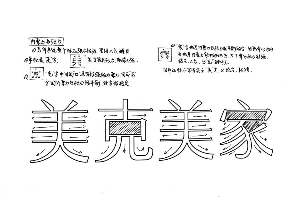 -中國(guó)漢字的特點(diǎn)天圓地方,方正曲直,容易給人造成錯(cuò)覺,就是筆畫是上下左右對(duì)齊,這是個(gè)嚴(yán)重的誤區(qū),字體于字體之間,字體內(nèi)部各構(gòu)件之間并不是絕對(duì)的物理上的對(duì)齊,更多的是視覺上的對(duì)齊,這是因?yàn)槿搜凼怯惺清e(cuò)覺的。以美字為例,兩點(diǎn)視覺上相等,實(shí)際上左點(diǎn)要比右點(diǎn)高一些,因?yàn)樽簏c(diǎn)的筆勢(shì)向下,視線是向下的,右點(diǎn)的筆勢(shì)向上,視線是向上的,這樣做些調(diào)整,正好彌補(bǔ)了視覺上帶來(lái)的錯(cuò)別。看起來(lái)兩點(diǎn)保持在同一水平線上。其次,美字橫左右兩端長(zhǎng)于視覺上相等,原因右捺筆勢(shì)向下,形成對(duì)外的擴(kuò)張力。每一個(gè)筆畫構(gòu)件的大小長(zhǎng)短高低錯(cuò)落,都是受到外界的影響干擾,不是孤立的存在。