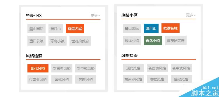 給大家舉個簡單的例子,這是常見的網頁標簽區塊,正常鼠標移過會顯示主色——橘色,右圖我做了一個錯誤的示例,倘若這個鼠標按鈕移過顯示橘色且按鈕放大,另外一個按鈕鼠標移過顯示藍色或綠色、且這個按鈕被縮小,這樣的交互體驗會有點糟糕,視覺上和交互上的不統一會讓瀏覽者使用起來比較難受,也比較突兀難以接受,所以我們都統一視覺元素的同時,交互也要做統一處理。