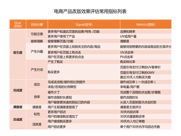 以下是筆者在五度模型的基礎上,結合在電商網站的實踐經驗總結的較為常用的模型和指標,具體使用時還是要從自身產品特點(信息型VS工具型),改版目的入手來選擇適合的指標。