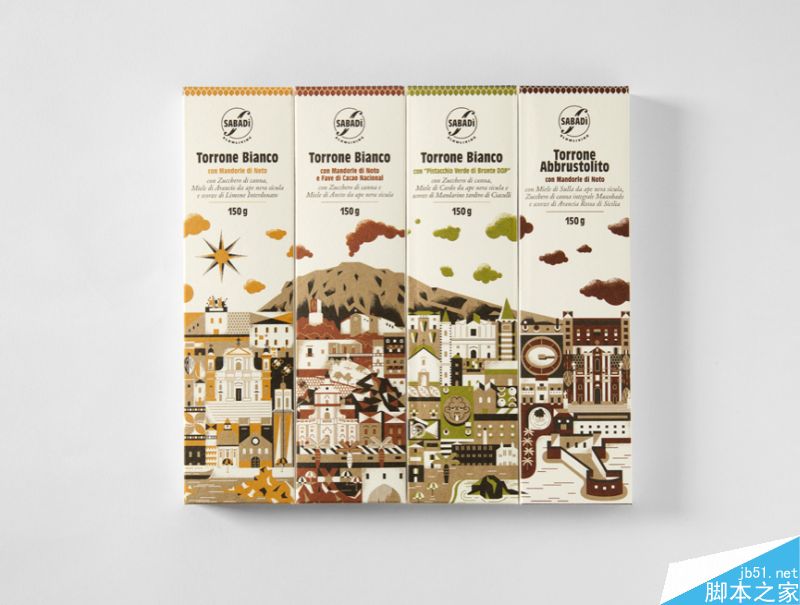 Happycentro工作室還為Sabadi’s Torroni的牛軋糖產品設計了這一系列包裝。他們將產品原產地西西里島的鄉村、街道、廣場、景點和人物融入到包裝的核心設計中,創造了動態的故事敘述,展現了一個淳樸、值得信賴的品牌形象。