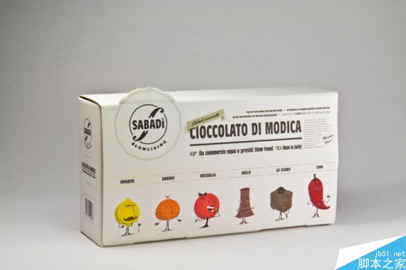Happycentro工作室為Sabadi六種口味的巧克力分別設計了相對應的卡通形象,讓原本美味的巧克力又平添了一些視覺吸引力。他們給每一種巧克力口味的原料加上面部表情和四肢,生動表現了產品特點,而且他們還精心創造了一種爭先恐后博關注的感覺來吸引觀眾注意。