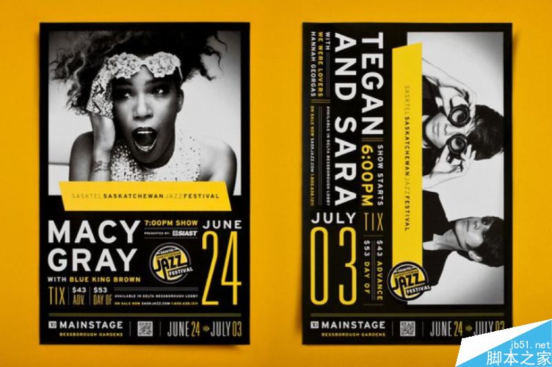 加拿大薩斯卡通市每年夏天都會舉行為期十天的Saskatchewan爵士音樂節。在Firebelly設計的2011年系列海報中,Macy Grey以及Tegan和Sara的頑皮逗趣形象體現了整個活動的自發性,此外,動態文案和明黃色的波普元素也為整個設計增添了亮點與活力。其色彩和各種元素的尺寸搭配產生了一種難以預料的視覺韻律感,從側面進一步體現了活動的性質。