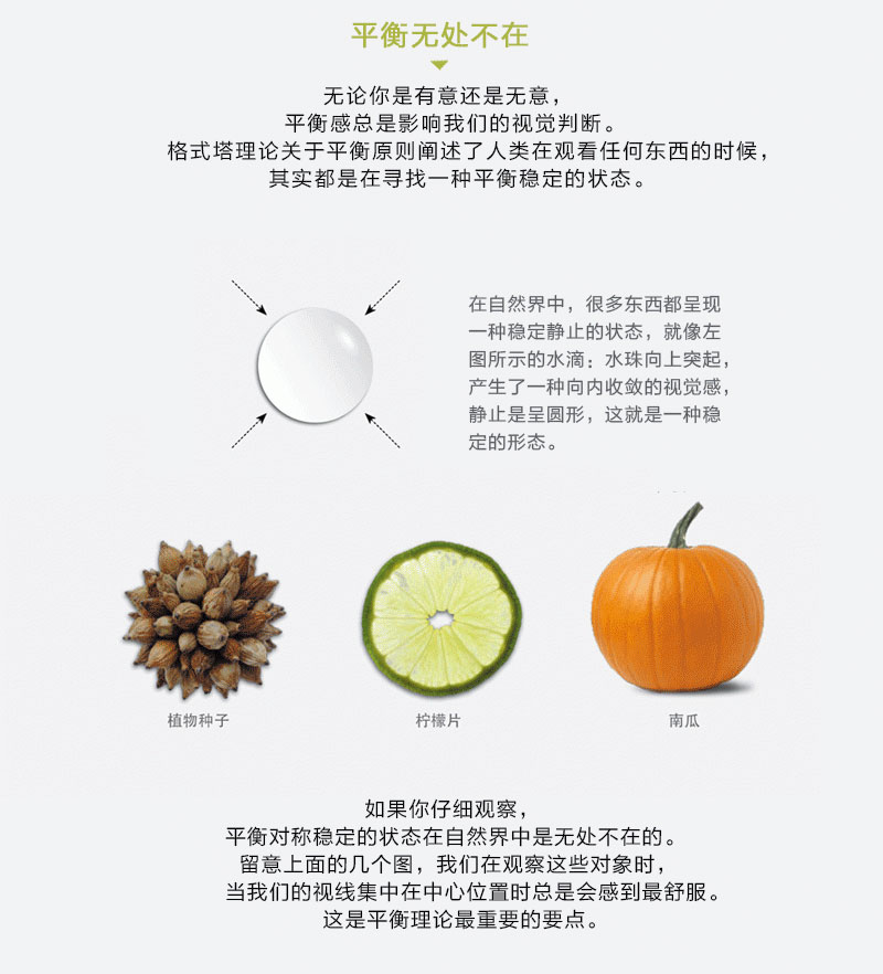 在進入正題之前,我們先簡單了解一下格式塔心理學。該學派理論只在解釋人類的行為是如何與視覺經驗產生關聯的。格式塔理論解釋了我們的眼睛對一個實物及其對象的理解是一個綜合的體驗,而不僅僅是我們所見的簡單疊加,他包含我們以前對該實物及對象曾有過的感受。格式塔并不是為了設計而提出的,不過了解格式塔理論可以成為你再設計工作中有用的運用知識。下面我們從四個方面對本次文章平衡進行講解。