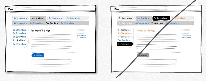 視覺風(fēng)格,如顏色、深度和對比度都可以當(dāng)做可靠的線索以幫助人們了解你的導(dǎo)航界面:我在哪里,我能去哪里。為了讓用戶清晰,可點(diǎn)擊元素(鏈接,按鈕)、已選擇元素(選擇的菜單)、以及純文本的樣式應(yīng)該是彼此明顯不同,而且在界面上要保持一致性原則。在視覺上,我們一般認(rèn)為藍(lán)色表示可被點(diǎn)擊,黑色表示已被選擇或是什么。