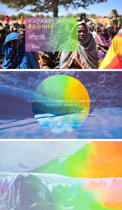 光感透氣疊加的方式讓顏色與其背后的內(nèi)容更和諧地相融在一起。在《國家地理》這組關(guān)于氣候變暖宣傳設(shè)計中,由于光感疊加令顏色漸變產(chǎn)生氤氳之感,直觀的傳達給讀者氣候變化的感受。