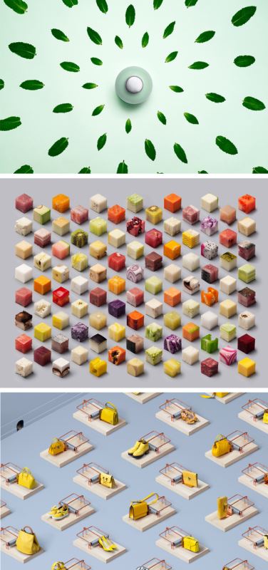 物體是由形狀,材質(zhì),顏色,排列等維度所構(gòu)成的。若將主體物進行打碎、分解、疊加等方式進行重組解構(gòu),從邏輯上打破其固有感官印象,由此物體將被賦予全新的含義。這種圖形通感化解構(gòu)的手段會讓人在視覺,味覺,嗅覺等多個方面觸發(fā)人的通感,從而引發(fā)人們對畫面下深層內(nèi)涵的聯(lián)想與思考。