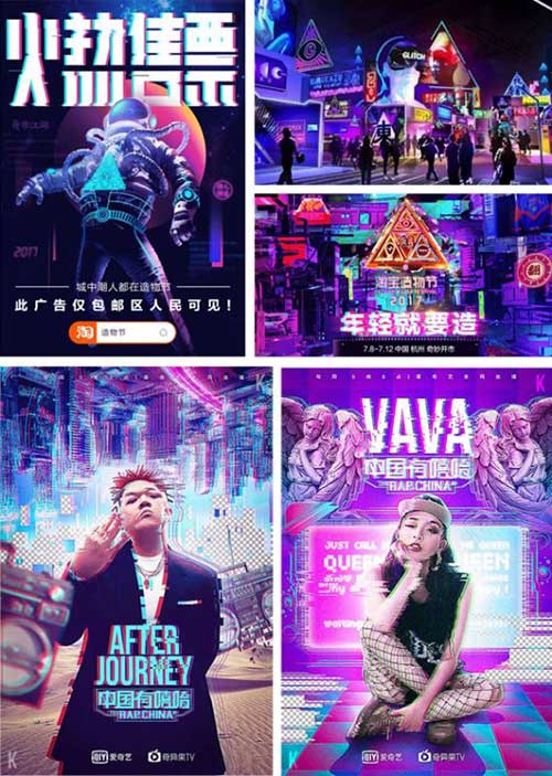 從天貓造物節(jié)到中國有嘻哈的海報,我們不難看出賽博故障風(fēng)在設(shè)計領(lǐng)域的影響。賽博朋克張揚的調(diào)性,符合現(xiàn)在年輕人標(biāo)榜自我的價值觀。而故障藝術(shù)這種刻意展現(xiàn)文件損壞狀態(tài)的視覺效果,令畫面更加具有科技發(fā)展中的不確定和未知感。