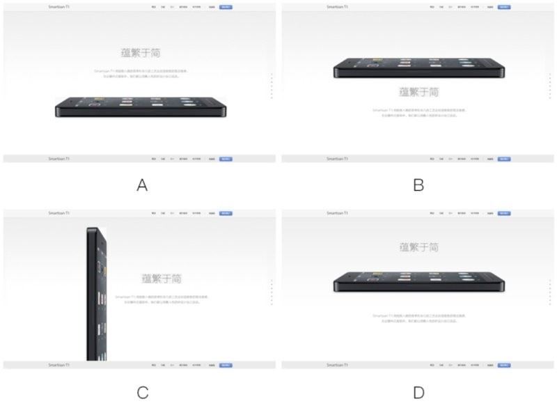 上面圖A、B、C是對頁面重新排版,圖D是原有的設計。雖然總體看起來都還可以,但是我們仍然可以很直觀的看出來,圖A的構圖有些頭重腳輕,讓人感覺中心偏下;圖B的手機主體物有種對文案的擠壓感,讓人覺得壓抑;圖C的手機和文案成為90°的夾角,讓人覺得有種阻礙感,不順滑;圖D的設計很好的協調了主體圖與文案的關系,并且給人一種從遠及近的中距離縱深感。整個畫面中間對齊更能最大限度的突出主體——手機。從錘子的網頁設計中我們可以觀察到,這種排版方式是中間對齊,無論是橫向還是豎向。