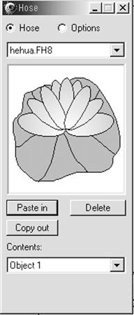 2、選中荷花組合體,將其整體縮小至合適大小,單擊命令面板上的copy命令;在hose面板上,單擊[paste in]按鈕,即可見面板的窗口出現荷花圖案,同時在面板下方的contents一列出現object 1,如圖8所示。