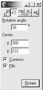 2、選中橢圓,點擊“edit/clone”命令,復制一個橢圓,選中復制的橢圓,然后雙擊工具欄中的[rotate]旋轉工具,彈出transform面板,其設置如圖2所示。(注意:其中center中的x、y值依據第一個橢圓的下方中心而定);執行該命令后將該橢圓往下面移動少許,此時的工作頁面如圖3所示。