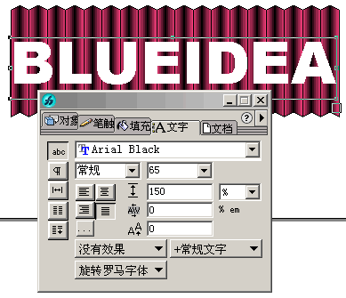 選擇工具面板中的文字,輸入文字blueidea,打開(kāi)文字面板,來(lái)設(shè)置一下文字的屬性。首先從字體下拉列表中選擇一個(gè)比較粗點(diǎn)的英文字體,本列中我選擇arial black,文字大小為65,字體大小得根據(jù)你的文字字?jǐn)?shù)來(lái)設(shè)置,盡量做到文字與手風(fēng)琴的二邊對(duì)齊。文字顏色并不重要,為了看的清楚些,在這兒我先設(shè)置文字的顏色為白色。