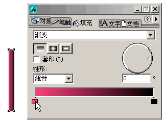 此時(shí)這個(gè)矩形對(duì)象處于被選擇狀態(tài),從樣本面板中將紅顏色和黑顏色(剛才設(shè)置的其中二種顏色)拖到填充顏色編輯條上的二條端點(diǎn)顏色上,左邊的顏色為紅色,右邊的為黑色,執(zhí)行完上述操作后,就完成了手風(fēng)琴的第一個(gè)隔板。