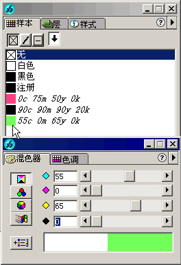 在freehand中新建文件,首先我們先在freehand中設(shè)置三種顏色,在freehand中設(shè)置顏色跟其他軟件有些不一樣,在這兒我們把打開(kāi)樣本面板和混色器面板,它們都位于菜單:窗口>面板 里面。在混色器面板中,默認(rèn)的顏色模式為cmyk,第一個(gè)顏色,我們分別設(shè)置c、m、y、k的值分別是0、75、50、0,此時(shí)面板右下部分會(huì)顯示出這種合成后顏色,拖動(dòng)顏色到樣本面板中,此時(shí)顏色會(huì)自動(dòng)加入到樣本面板中,如下圖所示。添加另外二個(gè)顏色,它們的cmyk值分別是90、90、90、20和55、0、65、0。