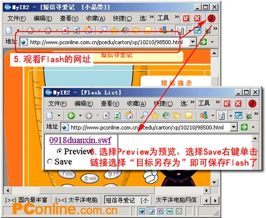這時(shí)我們的MyIE2就配置好了,下面我們就來(lái)進(jìn)行下載Flash文件的測(cè)試。我們打開PConline的“十大超級(jí)爆笑Flash小品欣賞”專題,找到要下載的“短信求愛(ài)記”,點(diǎn)擊鏈接看到播放Flash的頁(yè)面后,點(diǎn)擊剛才添加的“Save Flash”插件按鈕。