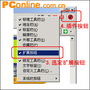 在MyIE2的菜單或工具欄空白處單擊鼠標(biāo)右鍵,在彈出菜單中選擇“擴(kuò)展按鈕”,這時(shí)你會(huì)看到在MyIE2的右上角出現(xiàn)一個(gè)Flash標(biāo)志的紅色工具按鈕。