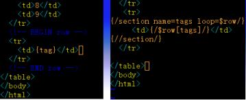 下面就深入到測試中來。先看看兩種模板文件的語法:藍條左邊是PHPLIB template的模板,右邊屬于SMARTY。個人偏好是不一樣的,所以這里不作評論。著重對比一下腳本里的處理語句,先看PHPLIB template的: $tpl->set_file('phplib', 'bigfile.htm');