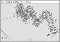 (6) 播放動畫可以看到球體的彈跳動作。下面為球體加入粒子發射器。確定 nurbs 球體處于選中的狀態,執行 particles → emit from object 命令,在彈出的對話框中為這個粒子物體命名為 ball ,單擊 add 按鈕添加粒子發射器。確認粒子處于選中的狀態,在通道欄中設置 rate 的值為 30 ,播放動畫觀看粒子的發射效果,如圖 10-30 所示。