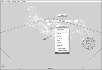 (9) 把粒子物體與地面物體連接上。重新選中粒子物體,然后將鼠標指針移動到碰撞物體上 ( 也就是 nurbs 平面物體 ) ,右擊,從彈出的快捷菜單中選擇 connect collision 命令,如圖 10-32 所示。