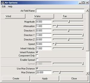 (3) 確認球體處于選中狀態,執行 fields → air □命令,在出現的 air options 對話框中單擊 wake 按鈕,設置 magnitude 的值為 10 ,然后單擊 create 按鈕。
