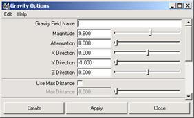 重力場主要用于模擬地球的引力,可以使被影響物體的沿固定的方向墜落,這種效果被大量的應用于虛擬顯示的環境中。執行 fields → gravity □命令,打開如圖 10-48 所示的對話框。