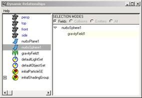 (5) 除了為物體添加剛體節點之外,還要為主體剛體制作出初速度和運動方向,這樣才能發生剛體動畫。選擇 dynamics|fields → gravity 命令。然后打開 dynamics relationships 窗口 (window → relationship editors → dynamics relationships 命令 ) ,選擇窗口左邊 outliner 中的 nurbssphere1 ,并且確保在所選窗口右邊框內的 gravityfield1 是高亮顯示,如果不是高亮顯示,單擊 gravityfield1 使它成為高亮顯示。如圖 11-9 所示。