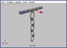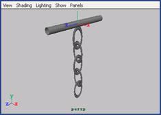(4) 選中棒和第 1 個環(huán),執(zhí)行 soft/rigid bodies → create passive rigid body 命令。然后,選中其他所有的環(huán),執(zhí)行 soft/rigid bodies → create active rigid body 命令。在這些環(huán)仍被選中的前提下,在場景中加入重力場 ( 執(zhí)行 fields → gravity 命令 ) 。播放動畫時,將會看到這些環(huán)落下來并且互相反彈著,最后在 200 幀左右停了下來,如圖 11-20 所示。