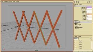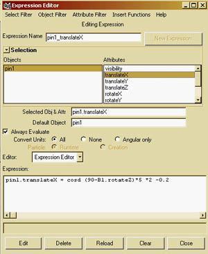 7 .再來復制多一組,分別取名 b5 、 b6 、 pin2 。選擇 pin2, 在表達式編輯器中鍵入 pin2.translatex = cosd (90-b1.rotatez)*5 4 -0.2 這條語句用來控制 pin2 隨著 b1 的 z 軸旋轉而沿著 x 軸平移。這次是乘以 4 ,每復制多一組,就要在前一組數值的基礎上加 “2”, 在第三組時就是 “6” 。道理不用說了吧。