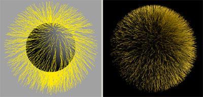另外一個主要部分是用一個 rat slim "rib generator" ( "f3dhair.slim" ) 生成。這個 rib 生成器把指定參數的點的數據用 rib 文件傳遞給渲染器 prman 。