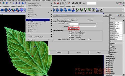 24. 選擇葉子模型 polgons > smooth 右邊的方格構選 smooth uvs 。