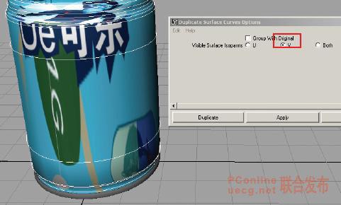 1 :選擇可樂罐,按 1 鍵最低精度顯示模型,并打開 edit curves > duplicate surface curves > ,選擇 v 向,復制 nurbs 曲線。