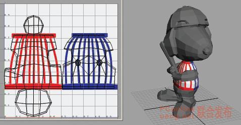 uvs 重疊 , 模型的貼圖就會重疊,重疊的模型部分紋理就會相同,不利于紋理貼圖的安排。例如我們將史盧比的衣服設計成前面紅條紋,后面蘭條紋,但由于左右兩邊的 uvs 重疊,造成貼圖重疊兩邊只能顏色統一,不能達到我們的要求。展開 uv 就能解決此問題。