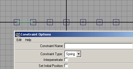 在每相鄰兩個(gè)立方體之間加上 spring-constraints,stiffness 設(shè)成 50,damping 設(shè)成 50 rest-length 設(shè)成 2