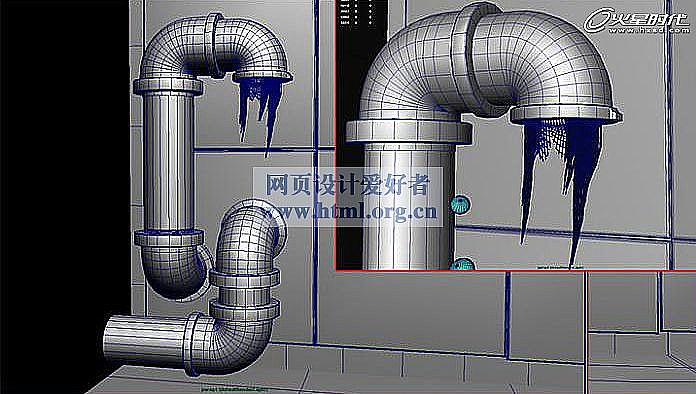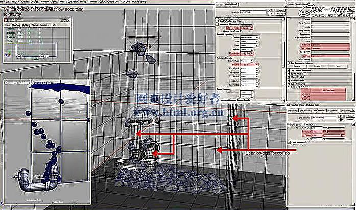 氣泡也是用相同的方法制作的,我把發(fā)射器放在水管結(jié)合處。借助Instancer屬性中的數(shù)學(xué)表達(dá)式,氣泡被適當(dāng)?shù)男D(zhuǎn)和縮放。在這種情況中,動(dòng)力學(xué)是最有用的。