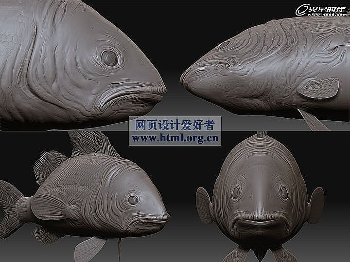 現(xiàn)在在場(chǎng)景的中心制作一條很普通的熱帶魚(yú)。正如我所說(shuō),我用了很少的參考去了解它的結(jié)構(gòu)和皮膚紋理。我還在相機(jī)的正視圖中導(dǎo)入了參考圖片來(lái)更好的掌握大形。首先做出一個(gè)魚(yú)的大形,然后再在ZB中添加細(xì)節(jié)。(圖09、圖10)