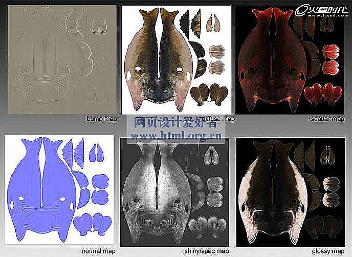 參考概念化之后,我真的需要很多有關(guān)水,氣泡,礫石,泥土磚的參考,尤其是魚(yú)的參考。我從網(wǎng)絡(luò)和自己的素材庫(kù)里收集所有可能有用的參考。要在一幅藝術(shù)作品中創(chuàng)造一個(gè)重要的角色,首先要了解它的解剖結(jié)構(gòu)。為了更好的建模和制作紋理,我研究了魚(yú)的解剖結(jié)構(gòu)。(圖04)