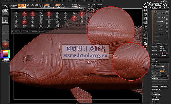 我決定在Maya中把魚(yú)做的盡可能的詳盡。在一級(jí)細(xì)分的模式下,我開(kāi)始用Standard brush和Inflate brush來(lái)雕刻出最基本的結(jié)構(gòu)。我繼續(xù)深入下去,尤其是在二級(jí)和三級(jí)細(xì)分下對(duì)鰭、鰓蓋、臀鰭、背鰭軟和尾鰭。(圖13)