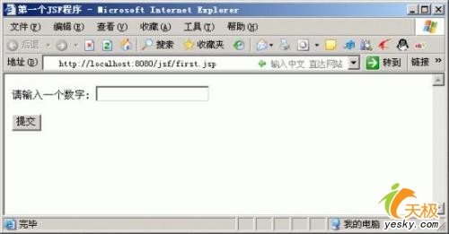 </f:view>標簽預示著jsf的開始,而它的下一個標簽form將建立一個html form。而outputtext標簽相當于html中的label組件。inputtext標簽相當于html中的textfield組件。而commandbutton標簽相當于html中的submit按鈕。運行這個jsp程序,將得到如圖1所顯示效果。