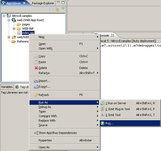上面的步驟中,我們已經完成了servlet容器的設置,現在可以開始運行例子了。展開appxplore視圖的nitroxexamples節點,在index.jsp節點上單擊右鍵,在彈出的上下文菜單中選擇run asàrun…。