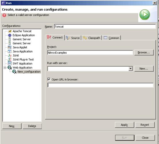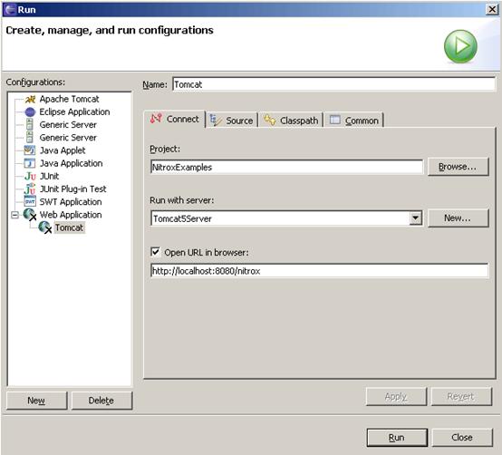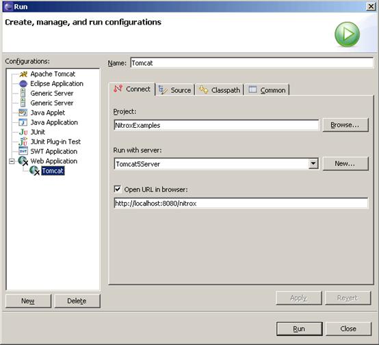 在彈出的窗口中,單擊左邊web application節點,單擊左下角的new按鈕,我們將看到web應用運行環境的配置界面,在name域輸入tomcat5,單擊project域后面的browe…按鈕,選擇前面創建的nitroxexamples工程。現在的配置界面看起來如下圖所示。