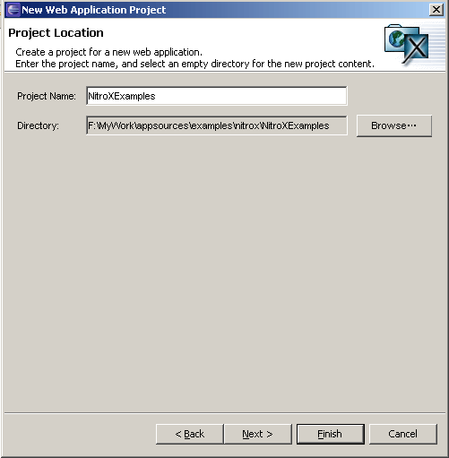 點擊next按鈕進入web工程名和目錄的配置,我們在工程名中輸入nitroxexamples,工程目錄使用系統默認提供的目錄。