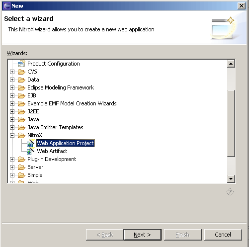 打開eclipse開發工具,點擊菜單fileànewàother…,在彈出的winzard選擇框中選擇nitrox下面的web application wizard。