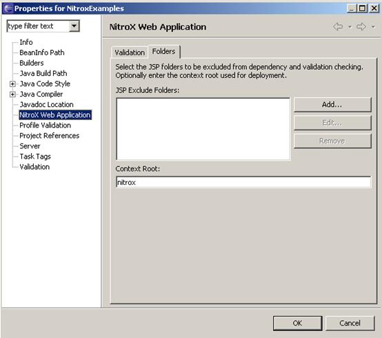 在appxplore視圖的nitroxexamples節點單擊右鍵,在彈出的上下文菜單中選擇properties,在彈出的項目屬性頁面上左邊的列表欄中選擇nitrox web application,在右邊的標簽頁中單擊folders標簽,在該標簽的context root下面的文本域中輸入nitrox,單擊ok按鈕完成設置工作。