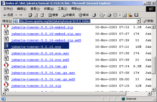 所以顯示完全和新建的吻合。接著就可以用一個.java來編譯為class來執行了。 第二部分 tomcatv5.0.16安裝 1、下載最新的tomcatv5.0.16 http://www.apache.org/dist/jakarta/tomcat-5/v5.0.16/bin/