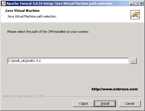 4、該處的jvm是自動查找的,如果您出現“no java virtual machine found” 也就是找不到java虛擬機。說明您的系統變量還沒有設定,有關系統變量的設定在 http://www.cnbruce.com/blog/showlog.asp?cat_id=26&log_id=295 “java環境安裝”已做解釋
